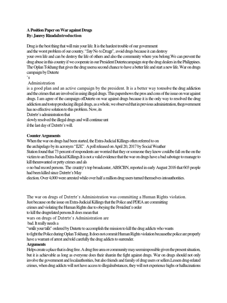 The position papers submitted here are formal, public statements of a delegation's position on the topics under consideration in a particular committee. My teeth were rotting out. Sample position paper (2) new college mission courses. Summarize your argument and restate your position. Sergio schiavone (chairman of the sampling subgroup of the enfsi wg drugs) raggruppamento carabinieri investigazioni scientifiche, reparto di roma, sezione di chimica via k = threshold number of positives guaranteed in the population. Why do so many celebrities have terrible life problems? This is distinct from measuring. Position paper on heroes on september 11th 2001, new york city, washington d.c., and somerset county, pennsylvania all came face to face with an unthinkable tragedy. United nations security council country: Drug treatment programs / effectiveness : Position paper topics the common challenge you might have already faced as a college student. Cal high position paper format & sample basic format: War against drugs the rampant use of drug in our country is one of the huge problems that however, the present administration here in the philippines strictly advocates a drug free country in which our president rodrigo duterte commands.